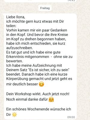 Mich hat es tief berührt, wie sich jede einzelne Frau verletzlich gezeigt und in einer Gruppe von (zunächst ganz) Fremden geöffnet hat. Vorgestern erreichte mich dazu ein Feedback, das zeigt, wie tiefenwirksam dieses Programm nachwirkt.